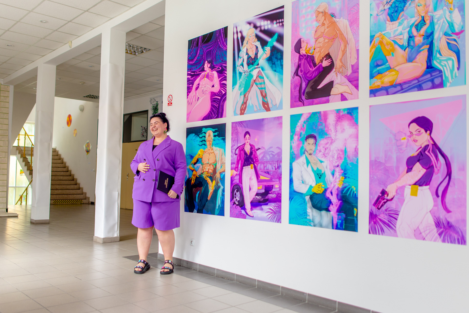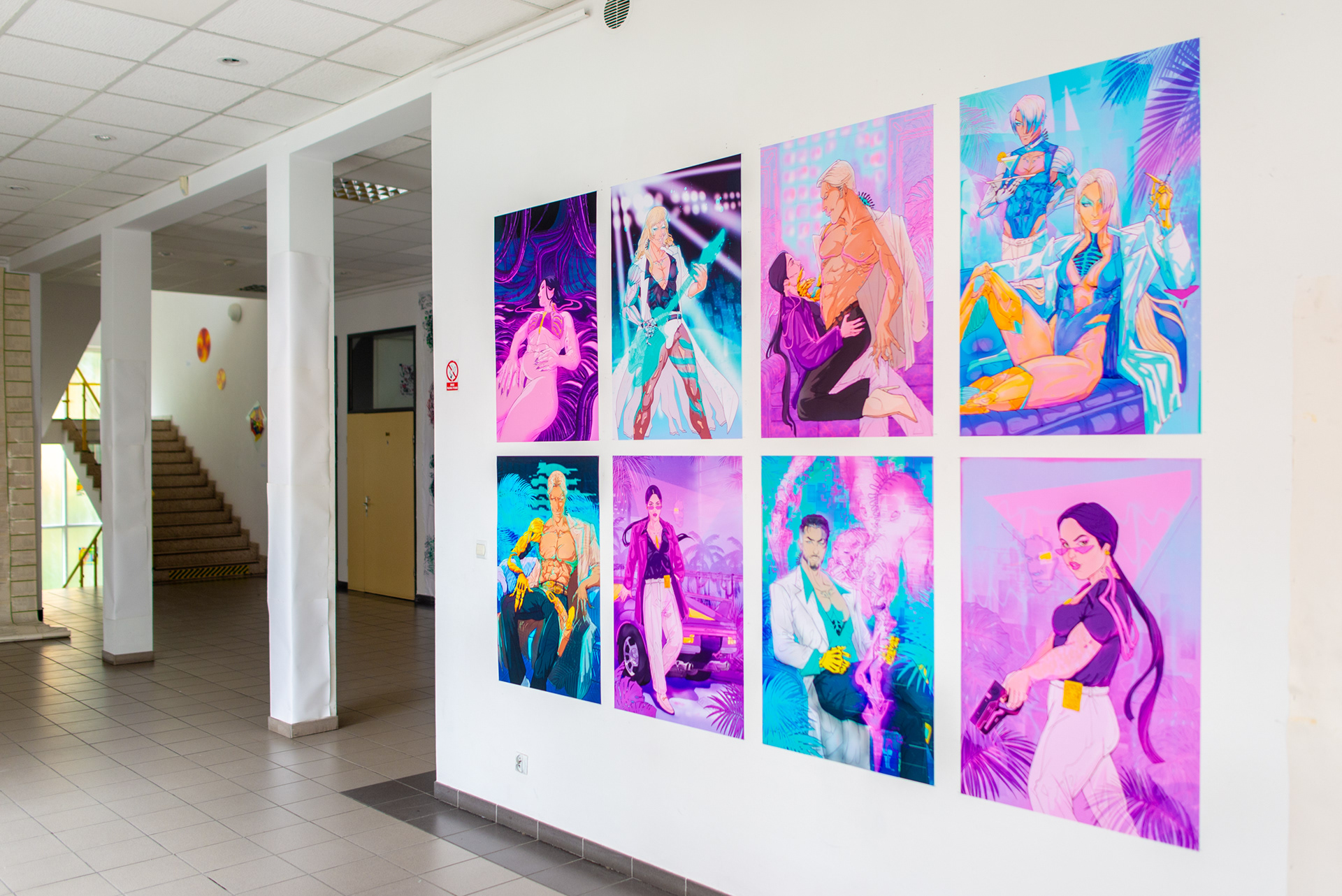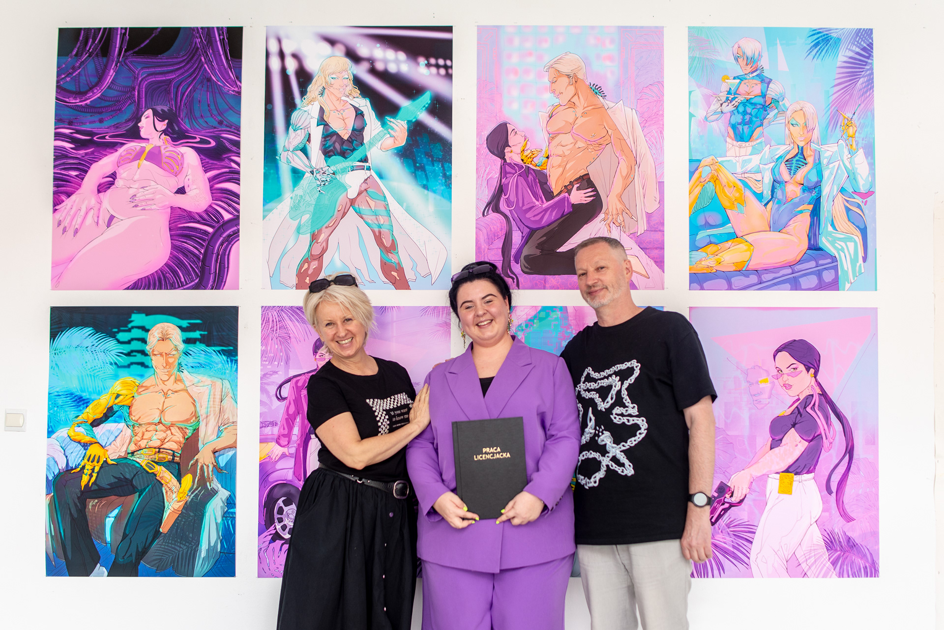 Do każdej pracy podchodzę indywidualnie, starając się odzwierciedlić autorskie postacie i związane z nimi historie Pani Detektyw. Na pracę dyplomową składa się osiem ilustracji w formacie B1 100 x 70 cm. Zrealizowane w technice druku pigmentowego i wydrukowane z najwyższą starannością. Grafiki powstały za pomocą ekranowego tabletu graficznego Wacom Cintiq16. Ilustracje są nasycone dusznymi neonami, krzykliwe kolory przenikają się między sobą tak samo jak kolejne warstwy grafik. Starłam się aby każda z nich opowiadała swoją historię i aby oglądający mogli/ły – chociaż przez moment – poczuć się jak mieszkanka/niec Kolegiatu Notrum'eos City. Zagłębić się w mój retro-futurystyczny świat i dać się uwieść tym powieściom. Tymi ilustracjami chciałam zamknąć pewien cykl w swoim życiu. Chciałam przede wszystkim pokazać przed sobą samą, że pomimo trudności jakie napotkałam przez ostatnie lata swojego życia – nikt, ale to nikt, nie jest w stanie odebrać ode mnie mojego autorskiego wykreowanego świata czy światów. I pokazać, że miałam siłę aby ukończyć swój drugi licencjat. Zapraszam do odbycia tej podróży w wykreowanym świecie razem ze mną.