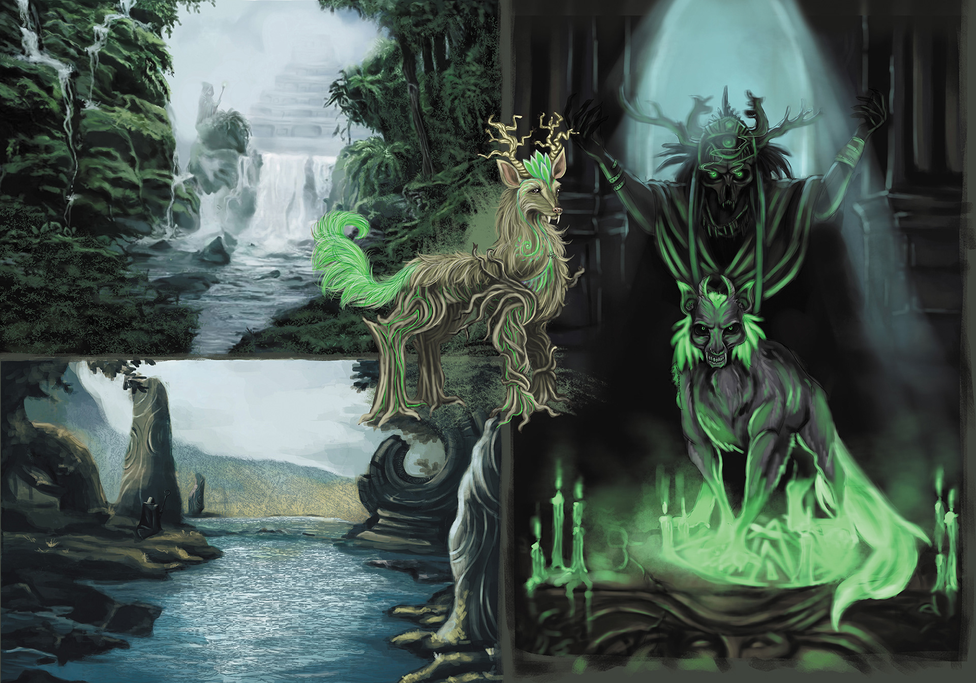 Ideą mojej pracy było stworzenie konceptu świata i tego co się na ten świat składa. Nie chciałam ograniczać tej pracy tylko do wizualizacji krain - pejzaży, ale także nadać im jakąś narrację. Dlatego postanowiłam stworzyć portrety liderów z którymi utożsamiane są klany którym przewodzą. Florę można było znaleźć już w pejzażach dlatego skupiłam się na przedstawieniu bogatej fauny tych światów i zilustrowałam, żyjące w poszczególnych krainach istoty. Żywioły poddałam także antropomorfizacji, czyniąc ich strażnikami - bogami, poszczególnych światów.