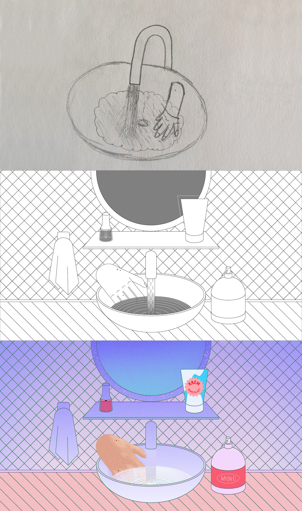 Kreuję świat, w którym gesty jakie wykonują dłonie to jedyna metoda porozumiewania się między bohaterami. Nie jest to jednak język migowy. To znaki rozpowszechnione niemal na cały świat, dzięki ich prostocie przekazu lub udziałowi mediów. Mimo to wiele ogólnie rozumianych gestów w kulturze zachodniej ma zupełnie inne znaczenie w kulturze Wschodu. Typowym przykładem jest uniesiony do góry kciuk, który w zachodnim kręgu kulturowym oznacza zwycięstwo lub akceptację, zaś w krajach Bliskiego Wschodu ma negatywny kontekst seksualny. To język pisany odzwierciedla najprecyzyjniej nasze myśli. Nie tylko zapisana treść wypowiedzi ma znaczenie, ale i sam wygląd liter - typografia, kolor. Ma też charakter trwały, to znaczy umożliwia komunikację również przy nieobecności adresata. Jedną z inspiracji zbudowania świata w taki sposób był odcinek serialu BoJack Horseman “BoJack lubi pływać”. Tam trudnością w porozumiewaniu się jest fakt znajdowania się pod wodą. Pismo i mowa istnieją od dawna, ale jak ich użyć na dnie oceanu? Odcinek jest niemal całkowicie niemy, opiera się na żartach sytuacyjnych zbudowanych na nieporozumieniach oraz różnicach kulturowych. Poza BoJackiem, wpływ na moją pracę miały nieoczywiste źródła - prostotę, linearność, operowanie symbolem a nie słowem z pierwszej części filmu, wzorowałam na jasnych w odbiorze a ubogich w detale instrukcjach IKEA, natomiast w drugiej części animacji używam pastelowych i neonowych gradientów charakterystycznych dla serialu The Midnight Gospel.