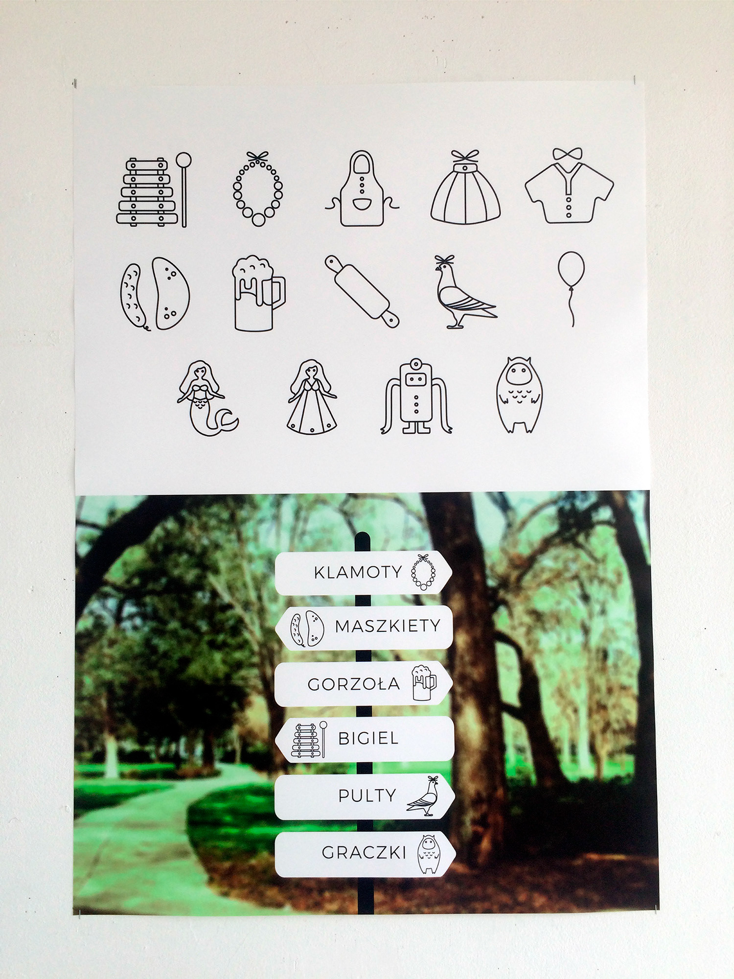 Kolejne elementy, projektowałam również z zachowaniem oszczędności środków wyrazu. W tym celu, postanowiłam stworzyć serię ikon informujących nas, o charakterze danego stoiska. Umieściłam je więc na drogowskazach informujących uczestników imprezy, w jakim miejscu znajdują się kolejne sekcje, ustawione na festiwalu, np; w jaką stronę należy się udać, aby zakupić biżuterię, lub gdzie odbywa się zabawa taneczna. Chciałam, aby ikony, były jednocześnie uniwersalne, na przykład by można było je, także użyć jako oznaczenia na mapie, bądź umieszczając je na plakietkach dla obsługi festiwalu (obstawiających dane stoisko).