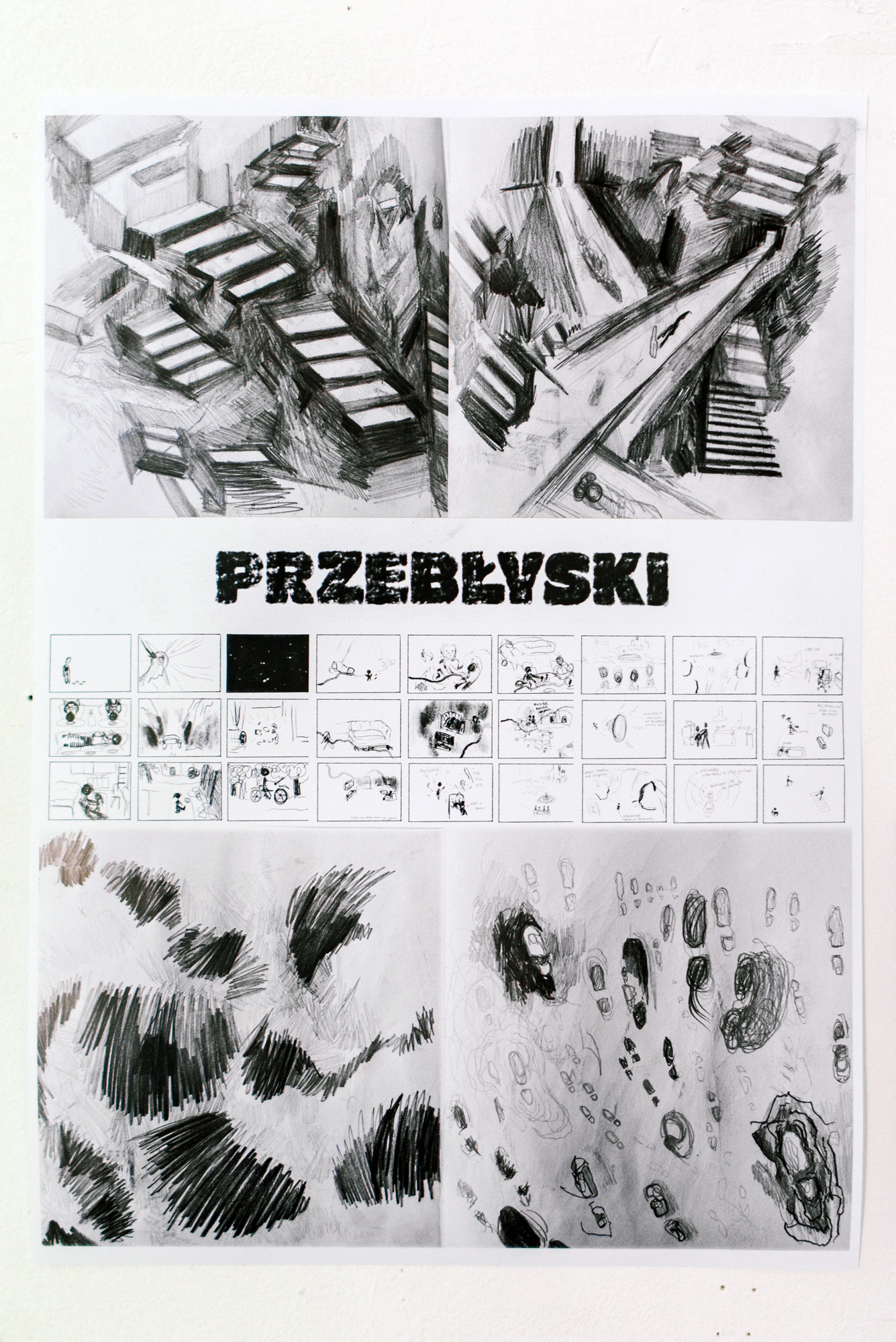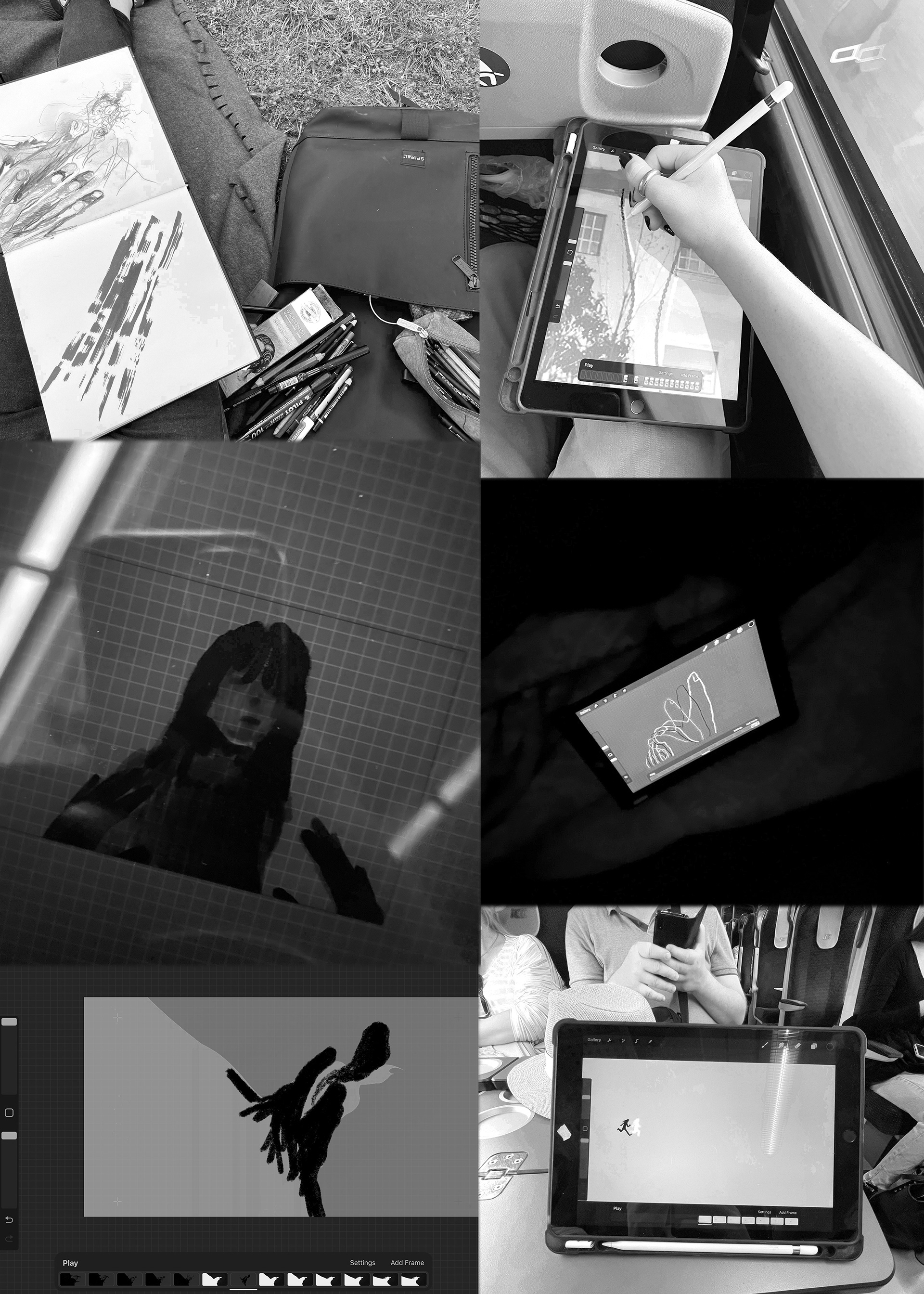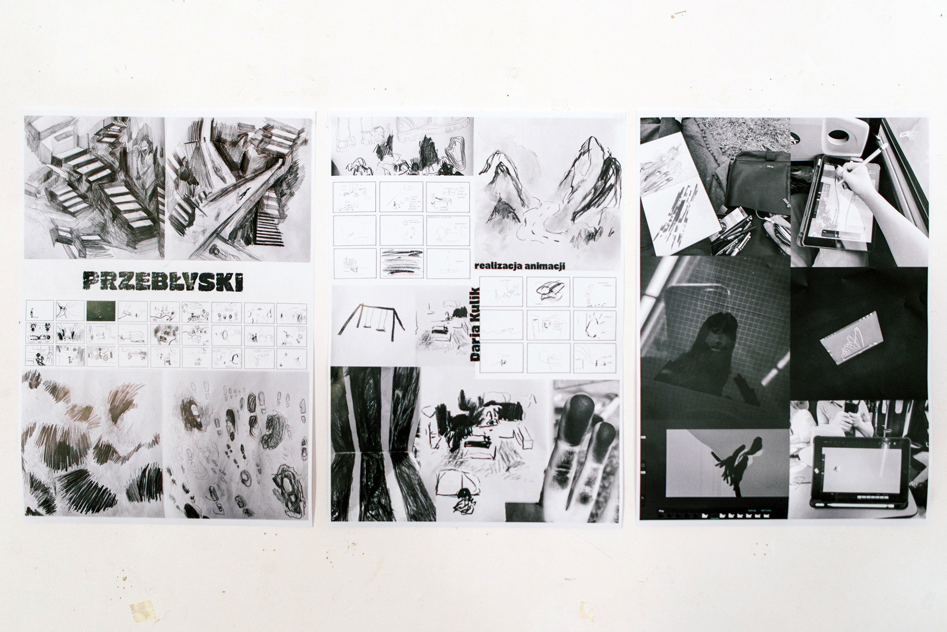 „Przebłyski” są ruchomym obrazem ukazującym pewne wspomnienia. Zdecydowałam się na animację, ponieważ od pewnego czasu w moich pracach brakowało mi „ruchu”. Chciałam, by te wszystkie rysunki, grafiki mogły opowiedzieć swoją historię. Zależało mi na tym żeby je ożywić, móc dokładniej pokazać, co miałam na myśli i co chciałam przedstawić. Animacja jest dla mnie dość nową dziedziną, więc na początku poszukiwałam różnych technik, które najbardziej by mi odpowiadały. Koniec końców zdecydowałam się głównie na rotoskopię. Oddaje ona najpłynniej to, co chciałam pokazać. W czasie moich poszukiwań obejrzałam trochę animacji i niektóre z nich zainspirowały mnie do stworzenia czarno-białego prostego filmu. Taką animacją była, na przykład, animacja „O matko!” Pauliny Ziółkowskiej. Prosta czarno-biała historia zainspirowała mnie, przekonała, że nie jest potrzebny kolor, by przekazać to, co ważne. Osobiście uważam, że czarno-białe prace mogą mieć nawet więcej do powiedzenia, niż symboliczne i odwracające uwagę kolory.