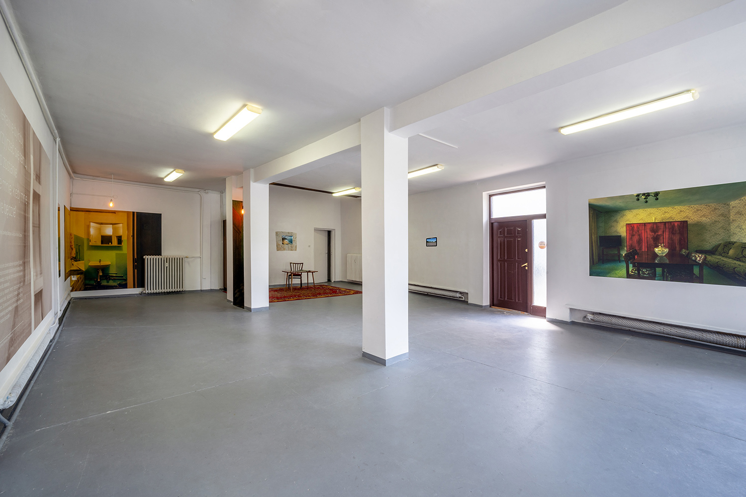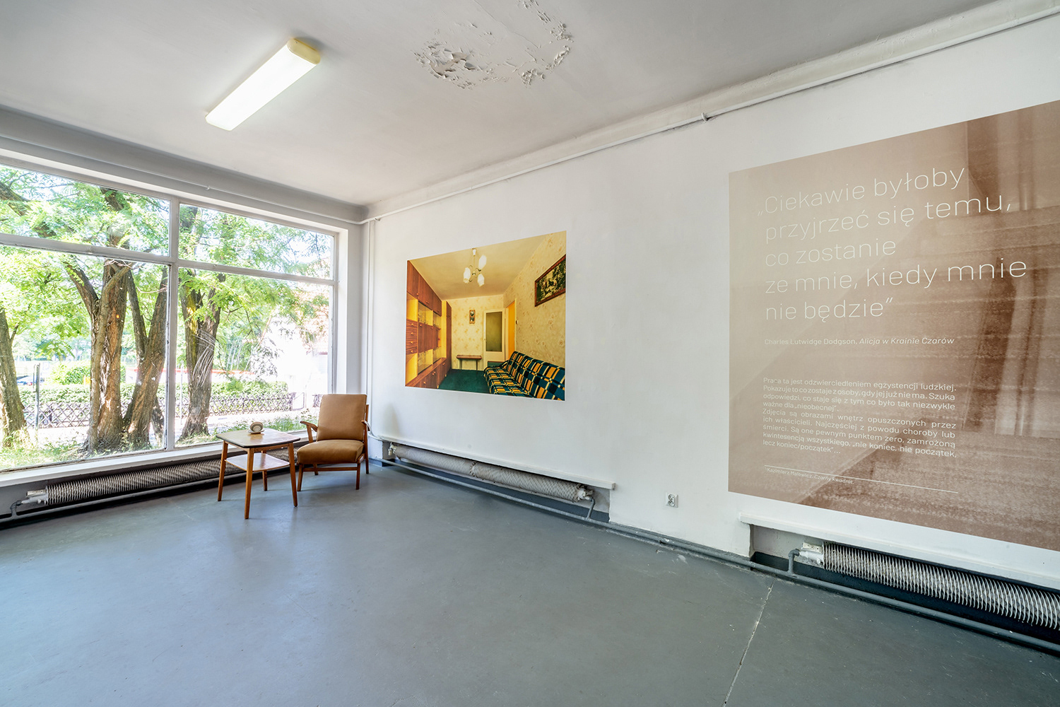 Praca dyplomowa została przedstawiona za pomocą wybranych fotografii, które stanowią podstawę do katalogu, gazety umieszczonej na ekspozycji wystawy, a także wydruków projektów graficznych, zamieszczonych w przestrzeni galeryjnej. Wydruki zostały wykonane i naklejone na ścianach i suficie galerii jako fototapety. Mają one wymiary od 2 x 1,35 metra najmniejsze (umieszczone jako pierwsze, po lewej stronie od wejścia, odnośnie ruchu strzałki zegara) do 3,5 x 2,5 metra największy (zamieszczony na suficie, po prawej stronie od wejścia, nad ekspozycją meblową). Naprzeciwko wejścia znajduje się grafika, która zawiera zdjęcie poruszone klatki schodowej oraz tekst narracyjny wystawy. Prezentowane wideo łączy projekt z sytuacją z życia autorki. Przedmioty, umieszczone w przestrzeni wystawienniczej, są nierozłączną częścią, uzupełniającą całość ekspozycji, równolegle jak i witryny we wnętrzu galerii. Rozumieć je można jako kolejny obraz, wideo, lub działanie performatywne, które jeszcze bardziej urzeczywistnia projekt, a także wprowadza do niego kolejne wnętrza znajdujące się za szybą. W ten sposób dostrzec można, że budynek galerii wraz z jej wnętrzem są w całości potraktowane jako obiekt wystawy.