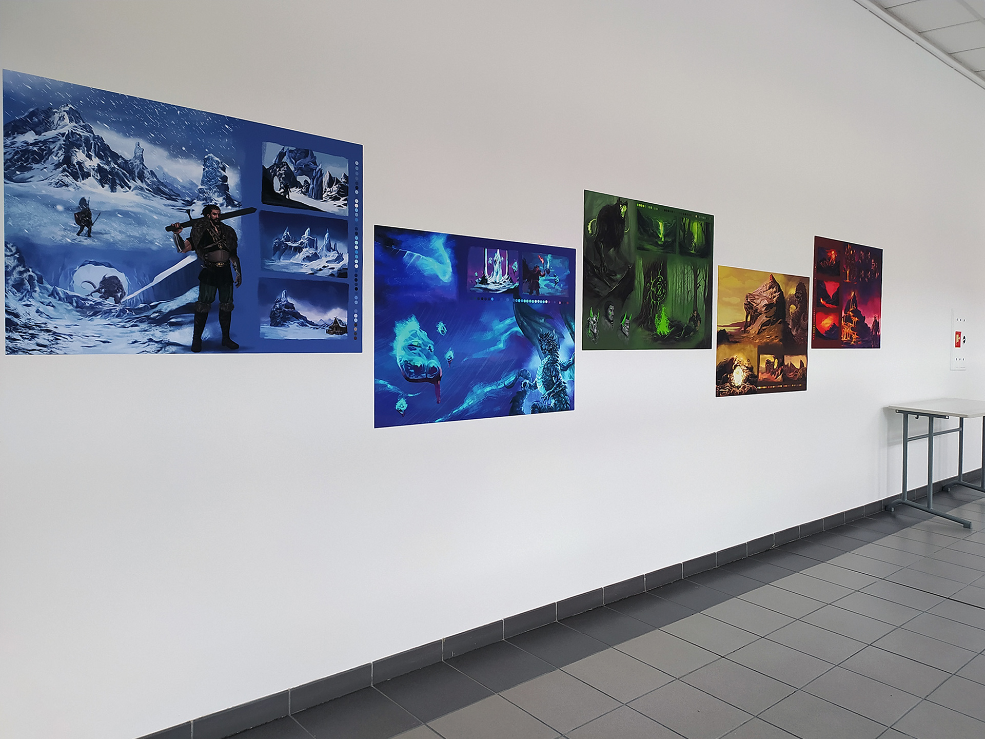 Motywowały mnie do tworzenia, krajobrazy pochodzące z różnych części świata, często bardzo odmienne. Na przykład jedną z inspiracji były pejzaże bieguna północnego, ale także takie zjawiska w przyrodzie jak zorza polarna. Chciałam stworzyć światy, które wyrażą klimat miejsc jakie przedstawiam. Stworzone miejsca działają czasem na zasadzie kontrastów np. mroźna kraina i pustynny pejzaż. Głównym celem stało się wykreowanie różnorodnych krain, w których będzie widać, że są to kompletnie kontrastowe i odległe miejsca. Kolor jest ważnym elementem pracy, to on nadaje im klimat, tak aby poczuć panujące w światach warunki i nastrój. Kierowałam się także skojarzeniami, które miały wpłynąć na postrzeganie przez odbiorcę przedstawianych miejsc w emocjonalny sposób. Na przykład las, ma charakterystyczny kolor zieleni, budzący skojarzenie z trucizną, która w popkulturze często przedstawiana jest jako zielona mgła. Neonowy i jaskrawy odcień tego koloru sprawia, że mamy poczucie niebezpieczeństwa. Wykorzystanie lodowej barwy niebieskiego w krajobrazie gór, ma pogłębić uczucie zimna. Użyte przeze mnie odcienie konkretnych kolorów mają budzić skojarzenia oraz wzmacniać odbiór prac.