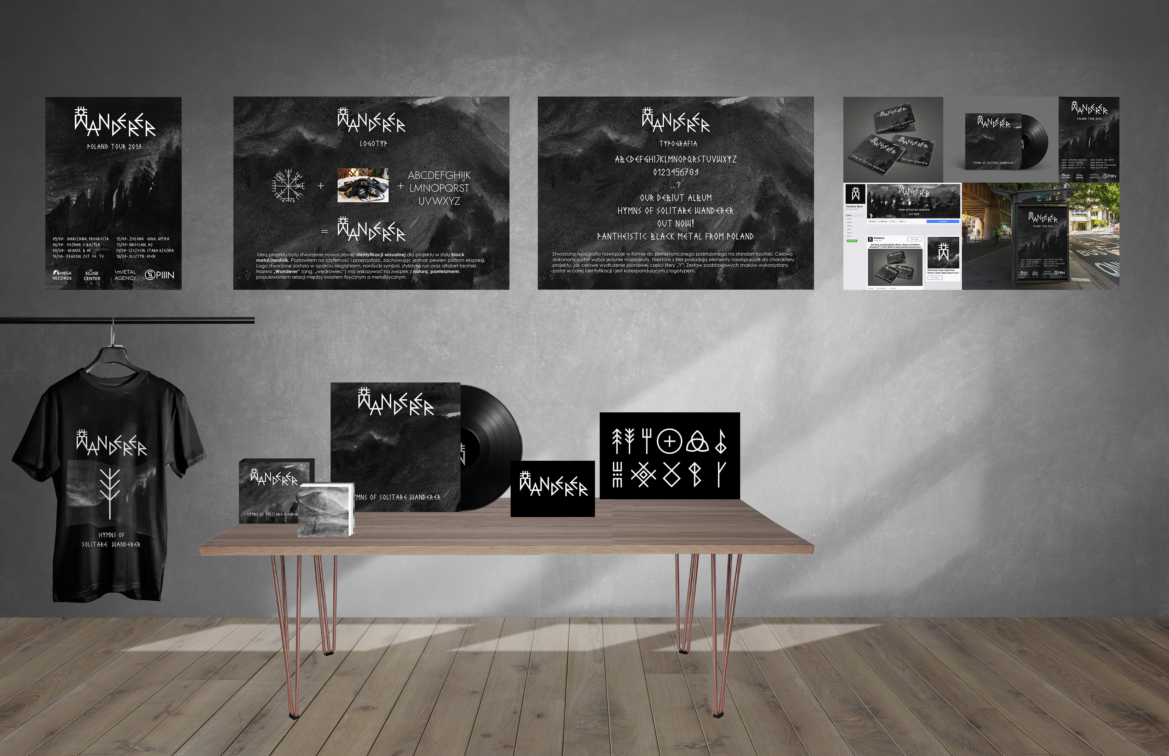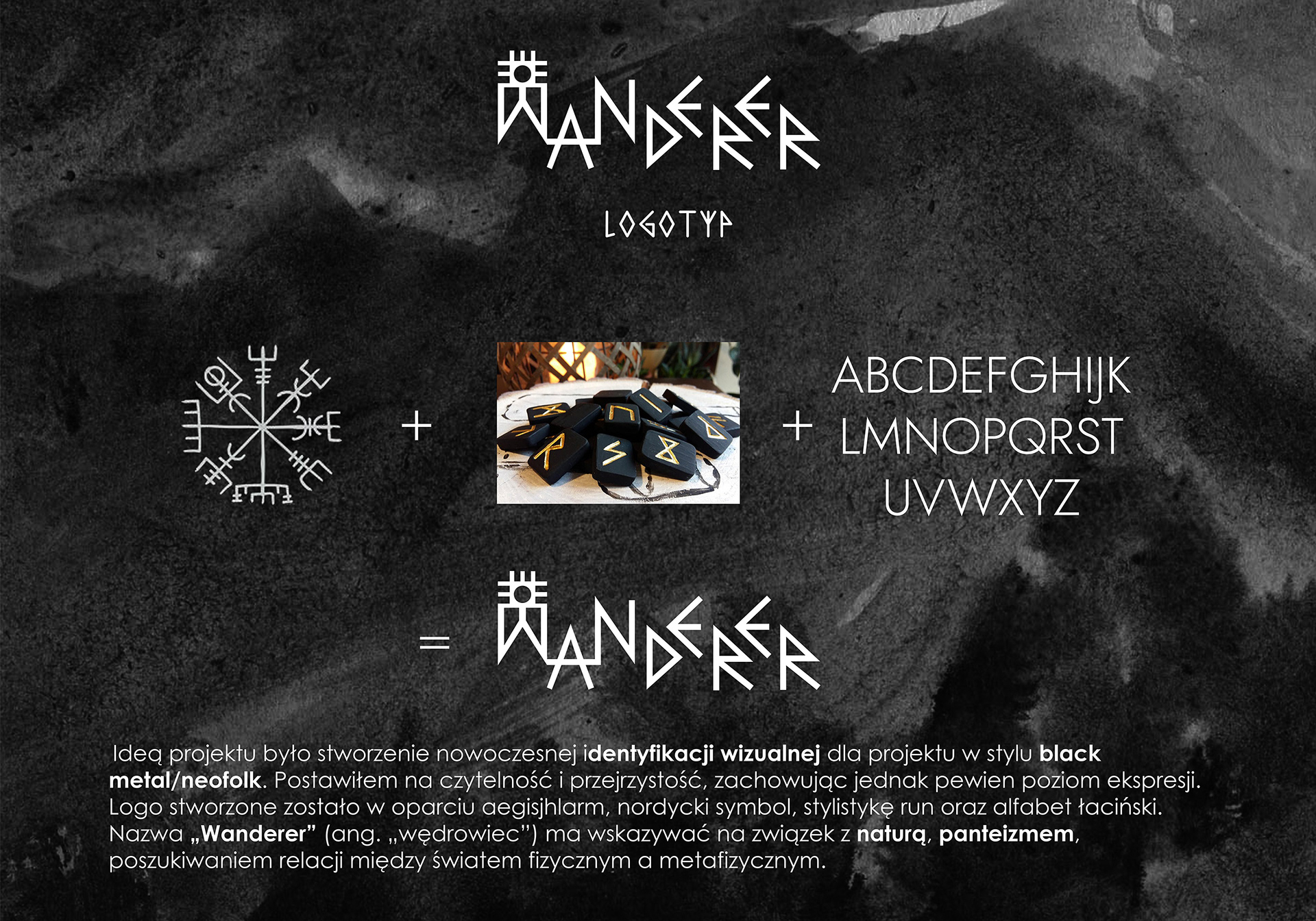 Logotyp i elementy identyfikacji wykonane zostały w czytelnej stylistyce. Logotyp stanowi syntezę symbolu Aegishjalmuru, stylistyki pisma runicznego oraz alfabetu łacińskiego. Wraz z logotypem stworzony został zestaw symboli spójny z koncepcją projektu. Owe symbole umieszczone zostały na kolejnych elementach identyfikacji, takich jak: okładki płyt, książeczka z ilustracjami, koszulki czy plakaty. Istotny w procesie był krój pisma zaprojektowany i stworzony w oparciu o wzorce runiczne, lecz zachowany w standardzie alfabetu łacińskiego. Klimat budowany jest również poprzez ilustracje w technice lawowanego tuszu, będące na pograniczu abstrakcji i realizmu - widoczne są inspiracje malarstwem romantycznym oraz nokturnami Whistlera. Z logotypu wyodrębniony został sygnet w postaci litery „W”. Ten element został umieszczony na powierzchniach o niewielkich rozmiarach, jak awatar strony na Facebooku, kostki do gry na gitarze czy naklejki. Do końcowej prezentacji zaprojektowane zostały plansze prezentujące symbolicznie koncepcję logotypu oraz typografii. Ponadto zaprezentowane zostaną okładki płyt, artbook, T-shirt z wzorami zespołu.