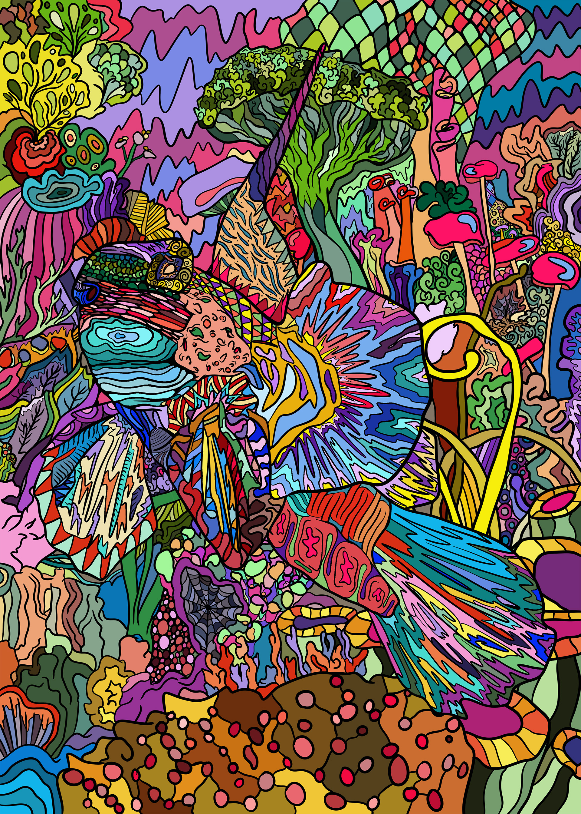To wszystko dało mi do myślenia i zmotywowało do stworzenia cyklu prac, który w połączeniu z moją pasją do rysowania, oraz zamiłowania do zwierząt przedstawia Labirynt Imaginacji. Trzeba się mu dokładnie przyjrzeć by odkryć, i prześledzić sedno poruszanego tematu. Umieściłem w nim osiem gatunków zwierząt żyjących w różnych ekosystemach, w których można się dopatrzeć ludzkich odpadów, śmieci. Z racji tego, że jest to jedna z głównych przyczyn wymierania zwierząt. Poprzez wplątywanie się, czy zjadanie śmieci, a także nielegalną utylizację chemikaliów – wylewanie w glebę, zatapianie w morzach i oceanach, lub wycinanie lasów pod pola uprawne stajemy się przyczyną ich wymierania. Każdy gatunek zmaga się z tym samym problemem, na swój sposób. Wybrane zwierzęta otaczają wyimaginowane postacie. Z częścią z nich spotkałem się w telewizji, serialach oraz innych filmikach zamieszczanych w Internecie. Stały się fragmentami plakatu, ponieważ są mi bliskie i często się z nimi utożsamiałem, z ich rolą i charakterem jaki został im nadany, w zależności od nastroju, dnia. Część postaci powstała z wyobraźni, czasami było to natchnienie chwili, obserwacja otoczenia, nastrój, stopień zmęczenia jaki towarzyszył mi podczas rysowania. Jednak nie odbiegają od siebie tak bardzo jak mogłoby się wydawać na pierwszy rzut oka. Również wyraźnie zauważalne są zwroty, czy wyrazy zamieszczone w postaciach, lub obok nich, w formie graffiti, oraz tagu. Ich proste przesłanie, uważam za pewnego rodzaju formę manifestu, w stosunku do ludzkich poczynań względem otaczającej nas natury.