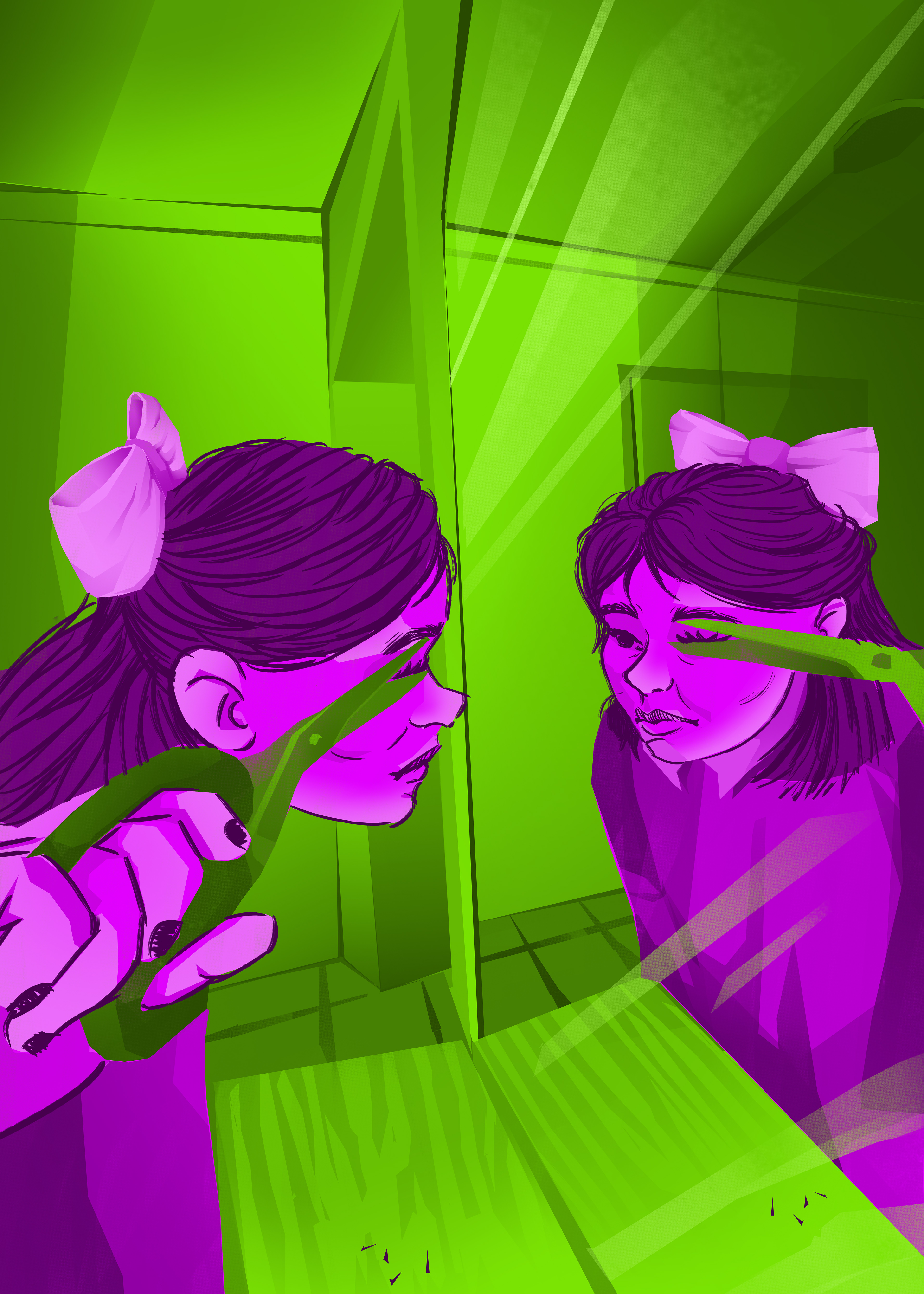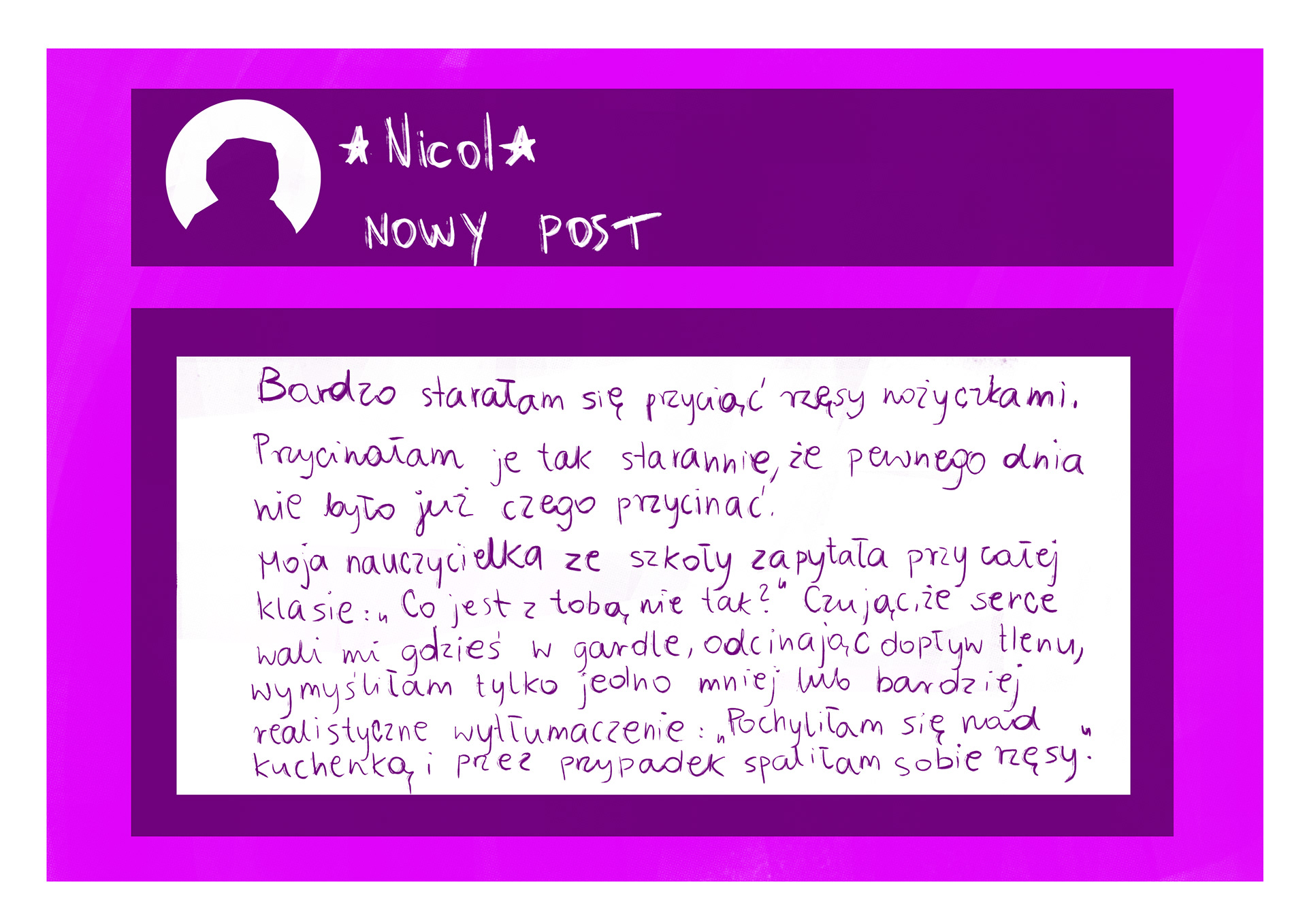 Moja praca opiera się na prawdziwych historiach osób cierpiących na zaburzenia psychiczne, takie jak schizofrenia, choroba afektywna dwubiegunowa, zaburzenia odżywiania, zaburzenia lękowe, zaburzenia obsesyjno-kompulsywne i depresja. Poprzez ilustracje chciałam pokazać moment, w którym choroba była najbardziej odczuwalna, po czym ludzie (lub ich krewni) zdawali sobie sprawę, że dzieje się coś złego i zwracali się po pomoc do psychiatry/psychoterapeuty. Źródłem historii były różne portale społecznościowe: anonimowe fora, strony internetowe oraz relacje moich znajomych. Ilustracje zostały przemyślane w taki sposób, aby poprzez kolor i elementy kompozycyjne pomóc przekazać stan emocjonalny i wewnętrzny świat postaci.