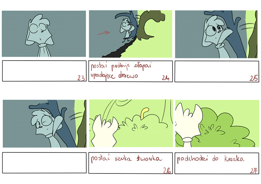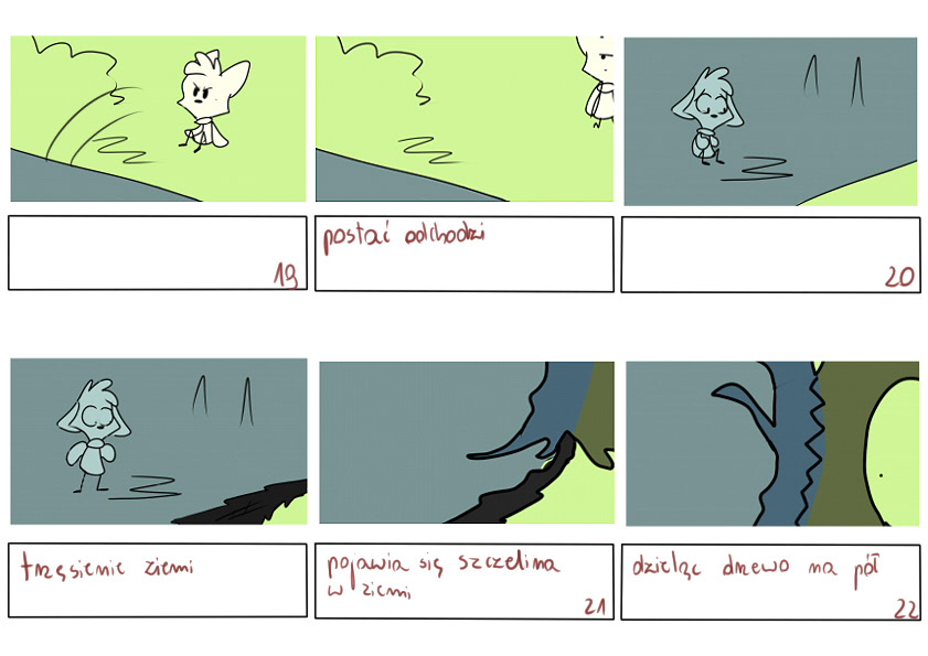 Chciałam oddać bajkowy, fantastyczny klimat, który często pojawia się w amerykańskich kreskówkach. Szczególną inspiracją jest dla mnie Alex Hirsch, którego doceniam jako reżysera oraz animatora. Pod kątem stylistycznym od zawsze intrygowała mnie twórczość Vivienne Medrano, która tworzy naprawdę ciekawe projekty postaci. Starałam się również oddać płynność ruchów, inspirując się animacjami, które wykonał James Baxter oraz podążając za wskazówkami Richarda Williamsa. Inspirując się różnorakimi animacjami, udało mi się wykreować moją własną produkcję.