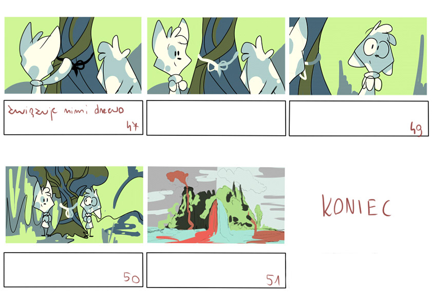 Animacja mocno się rozwinęła od czasu mojej młodości. Obecnie powstają głównie produkcje komputerowe robione metodą 3D. Animacja tradycyjna zawsze najbardziej mnie pasjonowała, dlatego zdecydowałam się na tę technikę w moim projekcie. Jest ona mocno pracochłonna, ale i daje niesamowity efekt. Każda klatka, ruch czy postać, narysowana jest przeze mnie, przez co, animacja wydaje się bardziej płynna i ekspresyjna. Czułam też, że ta technika pozwoli mi odzwierciedlić siebie, jak i swoje emocje, dzięki możliwości rysowania jej klatka po klatce. Poza rysowaniem samej animacji musiałam zmierzyć się z całym procesem produkcji – napisaniem scenariusza, stworzeniem postaci, świata oraz zadbaniem o oprawę dźwiękową. Było to dla mnie niemałe wyzwanie, ale i doświadczenie, które będę mogła wykorzystać przy pracy nad przyszłymi projektami.Chciałam, aby mój dyplom był zrobiony w formie historii, (przypominającą trochę amerykańską kreskówkę), lecz również miał być symboliczny, dający widzom przesłanie. Tematem mojej pracy jest — harmonia i akceptacja samego siebie. Akcja toczy się na wyspie, na której zamieszkują dwie postaci, przypominające z wyglądu antropomorficzne koty. Postacie są do siebie mocno podobne, różni ich głównie ułożenie uszu, wielkość oczu i kolor. Chciałam, aby wygląd oraz zachowanie pokazywały charakter, jaki mają bohaterowie animacji. Postacie reprezentują różne cechy charakteru, które posiada jedna osoba. Ciemno-niebieski kot jest reprezentacją wrażliwości, przezorności oraz strachu. Żółto – zielony zaś pokazuje cechy osoby ciekawej świata, chętnej do odkrywania nowych rzeczy. Osobowości te są kompletnie różne od siebie i nie potrafią żyć ze sobą w harmonii. Przezorność nie pozwala ciekawości na odkrywanie nowych rzeczy, gdyż uważa je za zbyt niebezpieczne — czyli zabrania tego samemu sobie. Każda z postaci postrzega świat inaczej, co przedstawiłam za pomocą podziału i koloru wyspy. Postacie są w animacji połączone za pomocą nici, która wychodzi z ich serc – pokazuje to, iż postacie wykreowane w animacji są symbolem jednej osoby. Wskutek nieporozumienia, nić pomiędzy nimi pęka. Ciekawość nie mogła już znieść przezorności i nadopiekuńczości. Wyrzuciła z siebie swoją część, gdyż uznała, że będzie jej bez niej lepiej. Na skutek czego, ciekawość nie potrafiła odróżnić zagrożenia i wszystko wydawało mu się bezpieczne, mimo że wcale tak nie było. Postać zaczyna dostrzegać zagrożenie, od którego chroniła go jego przezorność. Cała wyspa, która jest również symbolem relacji bohaterów, zaczyna się rozpadać. Kiedy postacie się rozdzieliły, ich relacja zaczęła się rozsypywać i przestały istnieć jako jedna osoba. Wyspa rozdziela się na pół, niszcząc przy tym drzewo, które było sercem całej wyspy. Bohaterowie muszą zrozumieć, iż potrzebują siebie nawzajem, aby ich relacja przetrwała. Dochodzą do porozumienia i pracują razem, żeby naprawić to, co sami stworzyli. Przezorność i ciekawość zaczynają rozumieć, że potrzebują siebie nawzajem, bo bez siebie nie są w stanie istnieć. Animacja ma na celu pokazać, żeby zrozumieć i zaakceptować samego siebie. Sam pomysł na film zaczerpnęłam z moich własnych codziennych doświadczeń. Przekonałam się, że im szybciej zaakceptuje się siebie takiego, jakim się jest, tym szybciej poczuje harmonię z samym sobą. Dzięki temu lepiej się czujemy, a wyrzucenie z siebie swojej części tylko sprawi, że przestaniemy być sobą.