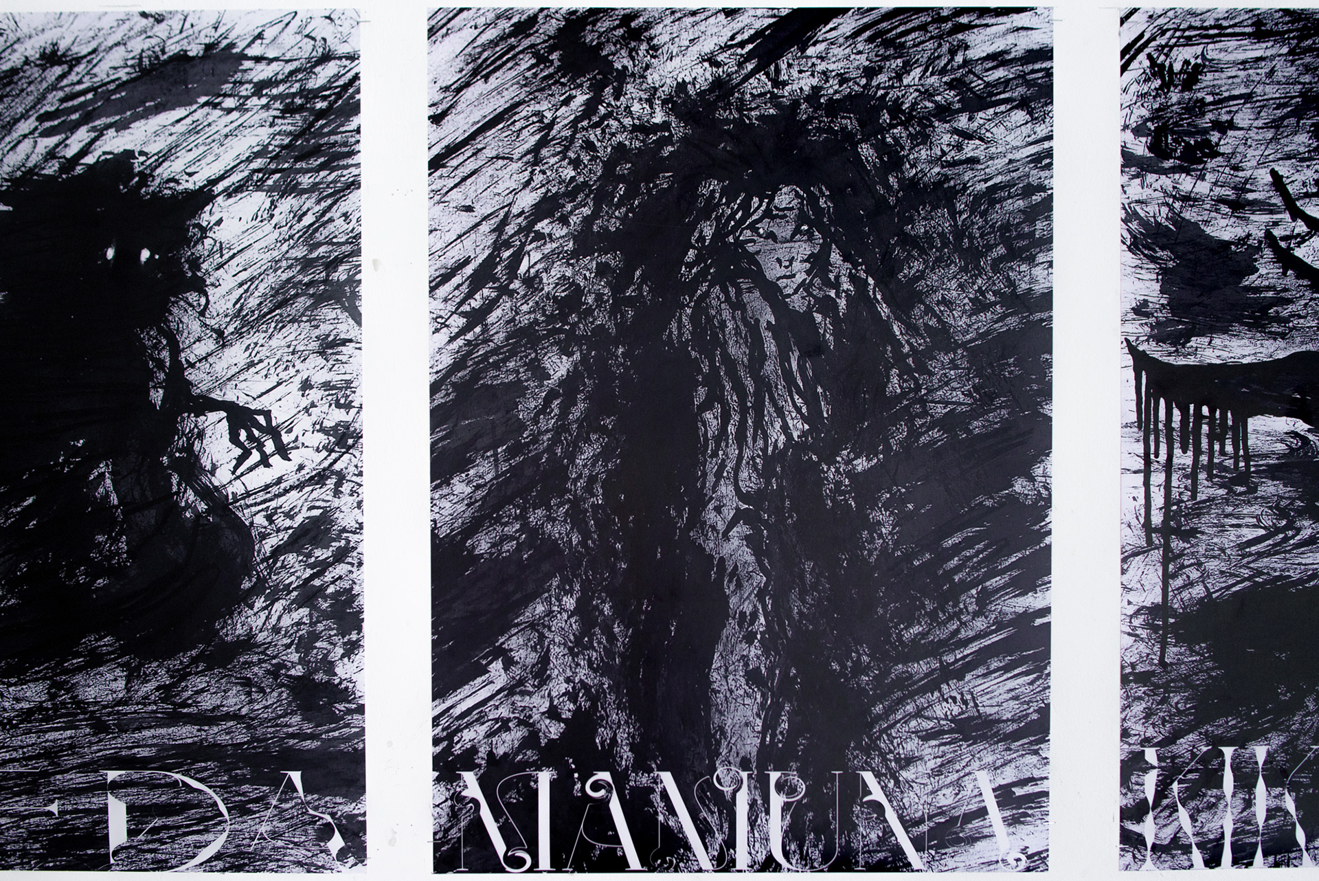Do każdej z bogini oraz demonów została zaprojektowana spersonalizowana typografia. Świadome deformacje wybranego kroju pisma mają nawiązywać swoim wyglądem do charakteru postaci bądź do ich aspektów wizualnych. Mają one również podkreślać dynamikę zawartą w mojej pracy oraz stać się podpisami dla przedstawionych postaci.