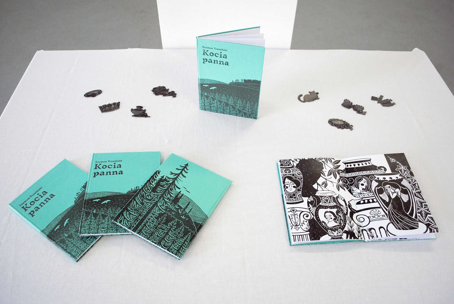 Siedem ilustracji w formatach 21x15 cm i 21x30 cm oddawać mają oniryczny, baśniowy, romantyczny nastrój panujący w opowiadaniu. Ich tajemniczy klimat celowo podkreślony został jeszcze czernią odbitek, która wprowadza do kompozycji równocześnie pozorny spokój i napięcie. W pracach dominują motywy roślinne, które mają bezpośredni związek z historią, która dzieje się w świerkowym lesie. Każda grafika łączy się z postacią kota, choć nie zawsze w sposób oczywisty. Ich celem jest obrazowanie niedopowiedzeń autora książki.