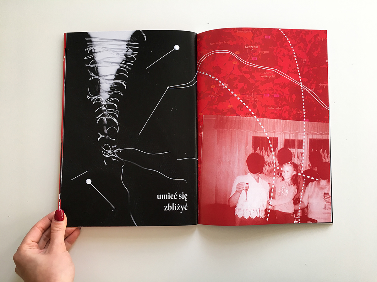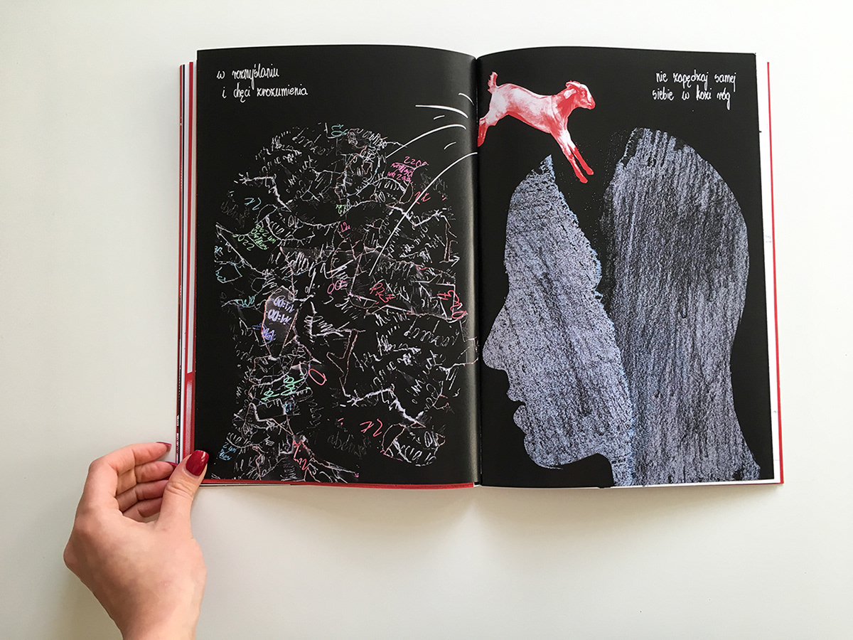 Książka złożona jest w formacie A3, składa się z ilustracji skomponowanych jako 11 spójnych rozkładówek z elementami interaktywnymi (zakładka, otwierana ramka itp.). Ilustracje wybranych haseł opierają się na kolorach: czarnym, białym i czerwonym. Łączą ze sobą fotografię, typografię i rysunek odręczny. Dodatkowo przygotowałam niektóre rozkładówki jako osobne wydruki w formacie B2 50x70cm.